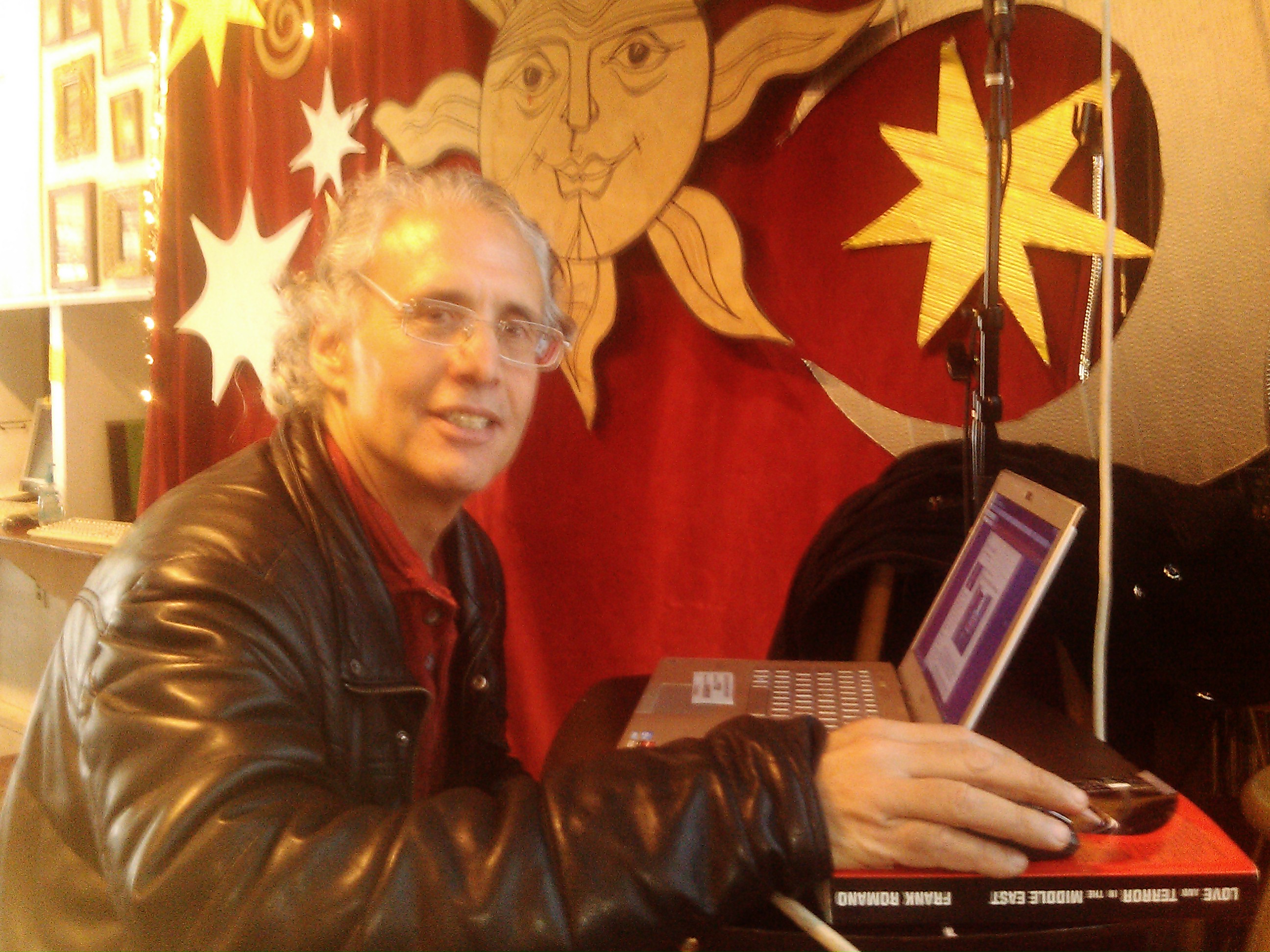 After the warning sirens were silenced we returned to the café for the event. . .a reminder of the urgency to keep the peace/freedom dialogues going (the subject of my book) and to reach out to the world to end this crazy war, to withdraw from this crazy occupation. As you can see, this was pure interfaith with Jews, Muslims and Christians. Help us to keep focused down the lighted cosmic path of unconditional, beautiful love. . .you and me brothers and sisters!